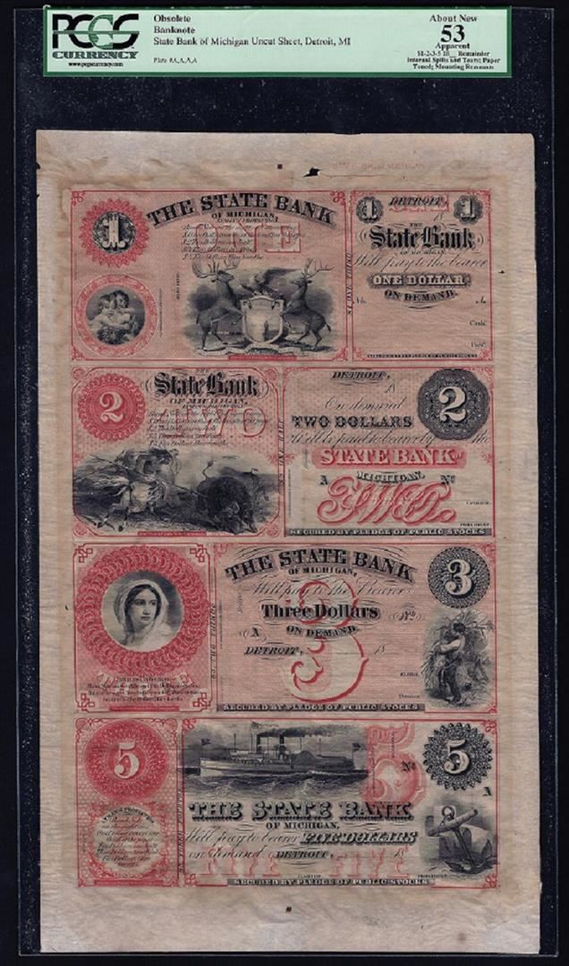 State Bank of Michigan Uncut Sheet of $1-$2-$3-$5 Obsolete Notes PCGS AU53 Appar