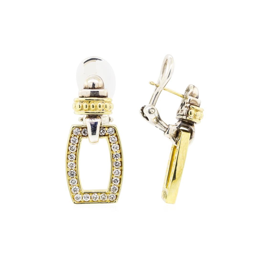 One pair of earrings with omega clip backs with posts featuring: sterling silver and 18KT yellow gold weighing 10.8 grams containing diamonds weighing 0.60ctw.