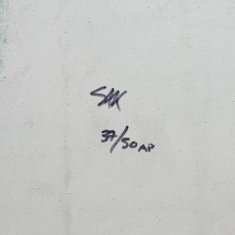 "1881 Morgan Dollar" is limited edition hand pulled silkscreen unique mixed media on canvas by Andy Warhol protege Steve Kaufman (1960-2010). This piece is numbered and hand signed inverso and includes a letter of authenticity. As is common with Kaufman's works, this piece may have perceived minor flaws, but is in overall good condition. Measures approximately 15.5" x 14" before cropping.