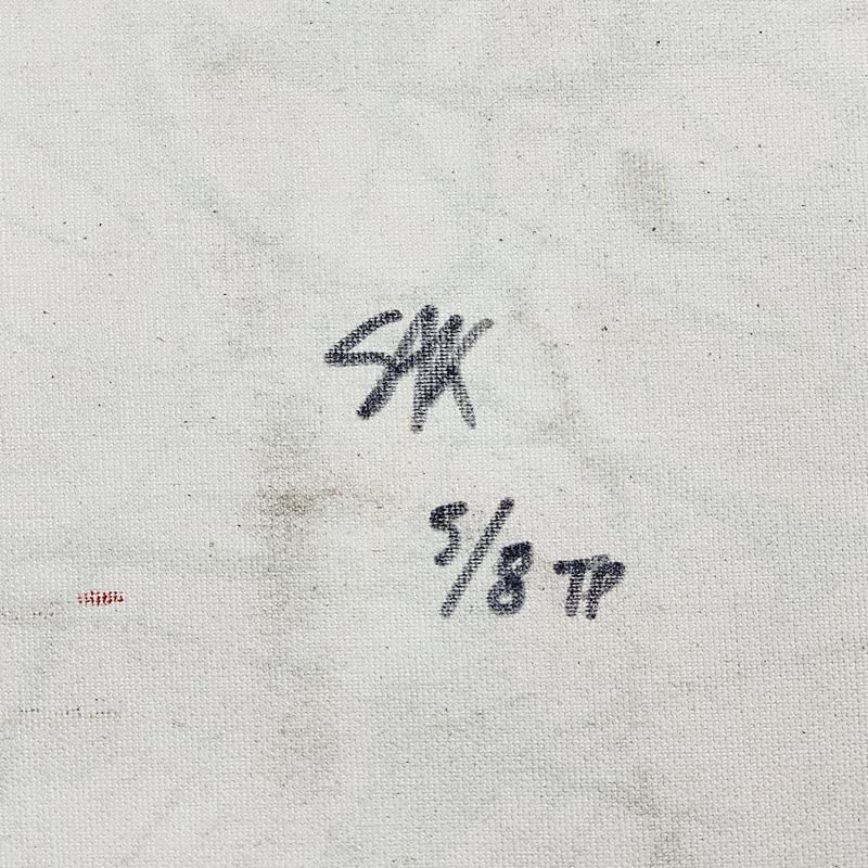 "1896 $2.00 Silver Certificate" is a limited edition hand pulled silkscreen mixed media on canvas by Andy Warhol protege Steve Kaufman (1960-2010). This piece is numbered and TP 5/8 and hand signed inverso. Includes letter of authenticity. As is common with Kaufman's works, this piece may have perceived minor flaws, but is in overall good condition. Measures approximately 17.5" x 35" (image).