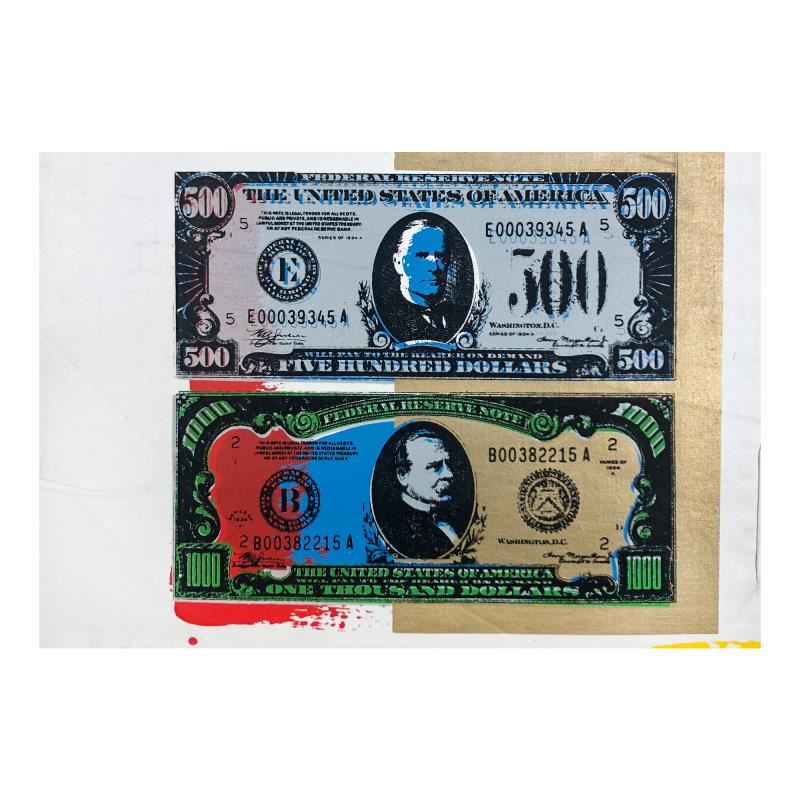 "500 and 1000 Dollar Bills" is limited edition hand pulled silkscreen unique mixed media on canvas by Andy Warhol protege Steve Kaufman (1960-2010). This piece is numbered and hand signed inverso and includes a letter of authenticity. As is common with Kaufman's works, this piece may have perceived minor flaws, but is in overall good condition. Measures approximately 13" x 18.5" before cropping.