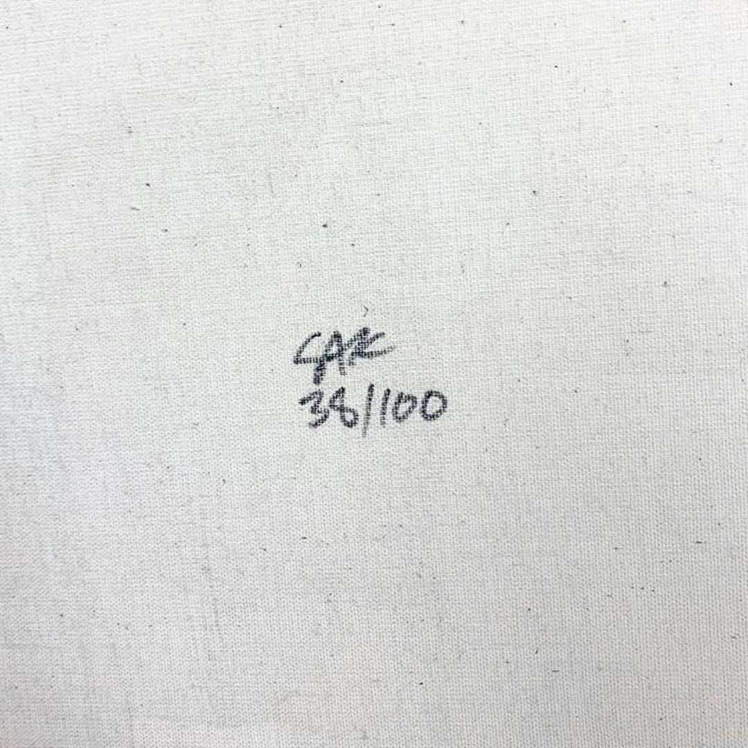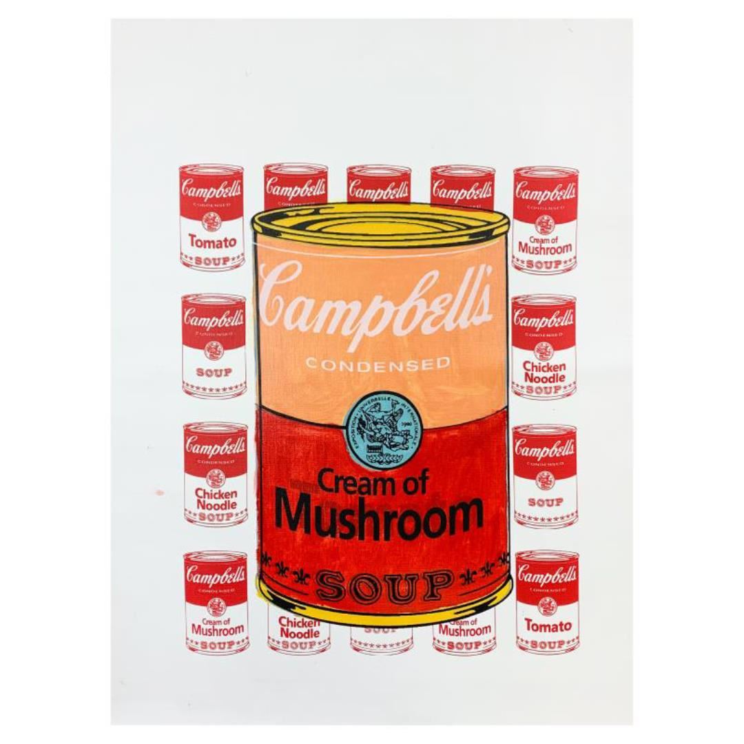 "Campbell's Mushroom" is a limited edition hand pulled silkscreen mixed media on canvas by Andy Warhol protege Steve Kaufman (1960-2010). This piece is numbered and hand signed inverso and includes a letter of authenticity. As is common with Kaufman's works, this piece may have perceived minor flaws and creases. Measures approximately 24" x 18" (image).