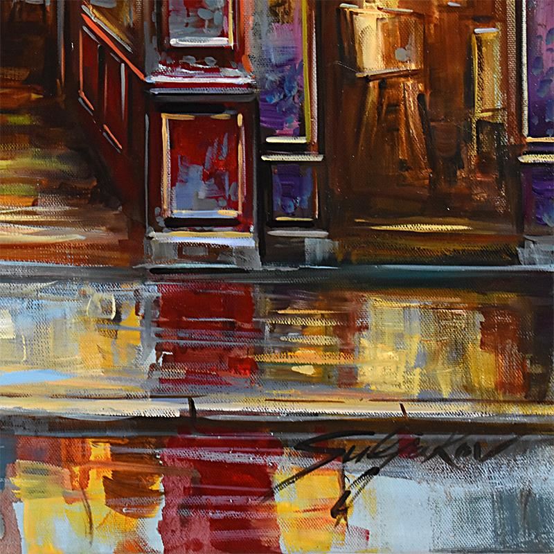 "Fantomas" is an original oil painting on stretched canvas by Vadik Suljakov, hand signed by the artist. Includes Letter of Authenticity. Measures approx. 40" x 30" (image).
