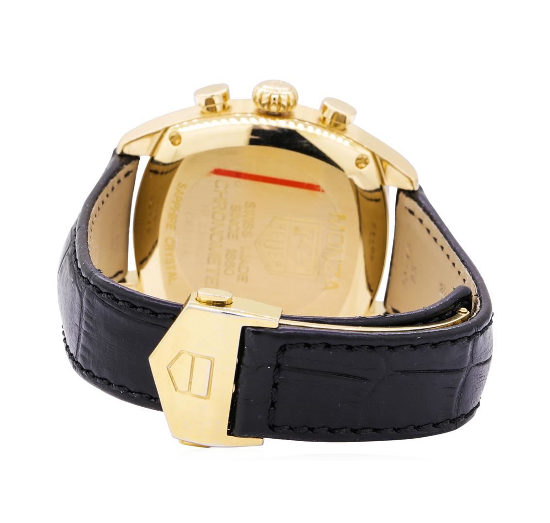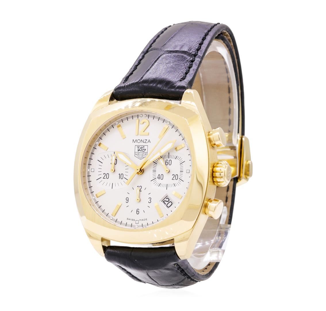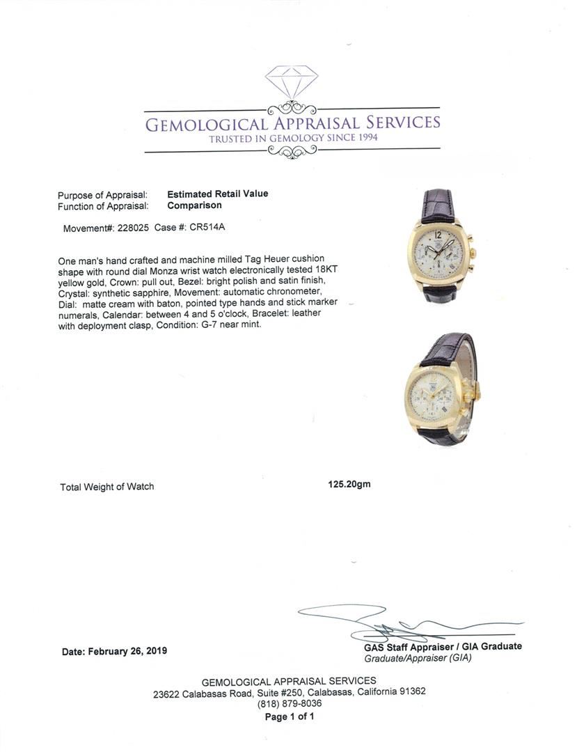 One man's, hand crafted and machine milled Tag Heuer cushion shape with round dial Monza wrist watch electronically tested 18KT yellow gold, Crown: pull out, Bezel: bright polish and satin finish, Crystal: synthetic sapphire, Movement: automatic chronometer, Dial: matte cream with baton, pointed type hands and stick marker numerals, Calendar: between 4 and 5 o'clock, Bracelet: leather with deployment clasp, Condition: G-7 near mint. Total Weight of Watch 125.20gm. GAS Appraised.