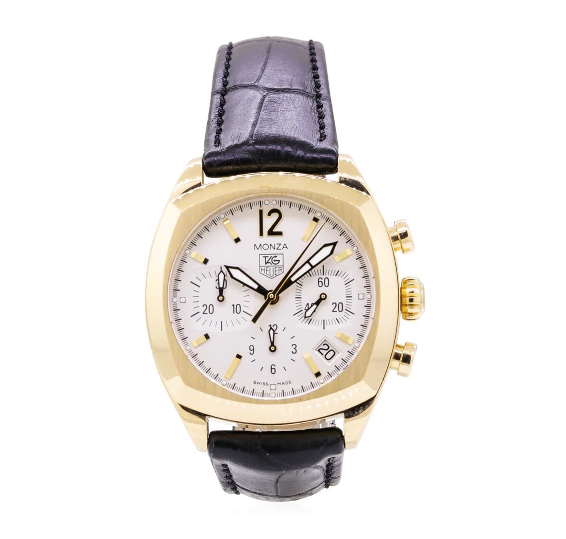 One man's, hand crafted and machine milled Tag Heuer cushion shape with round dial Monza wrist watch electronically tested 18KT yellow gold, Crown: pull out, Bezel: bright polish and satin finish, Crystal: synthetic sapphire, Movement: automatic chronometer, Dial: matte cream with baton, pointed type hands and stick marker numerals, Calendar: between 4 and 5 o'clock, Bracelet: leather with deployment clasp, Condition: G-7 near mint. Total Weight of Watch 125.20gm. GAS Appraised.