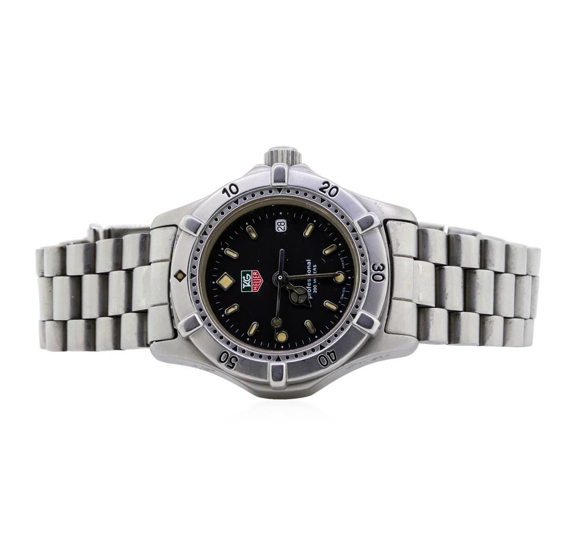One Tag Heuer Professional stainless steel quartz wristwatch with a black dial and a 28 millimeter wide case with a matching matte finish bracelet.