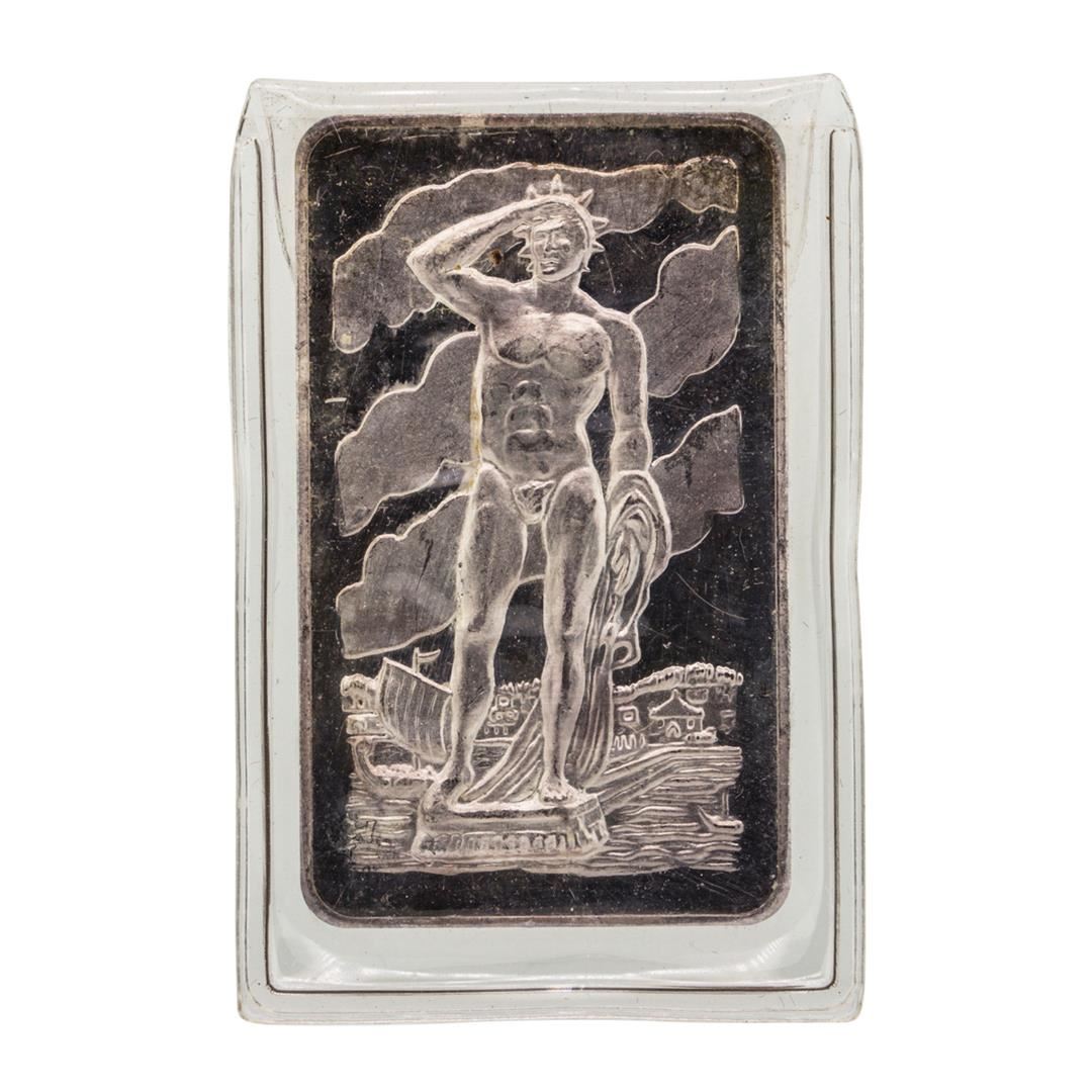 One The Colossus of Rhodes 1 oz .999 Pure Silver Art Bar.