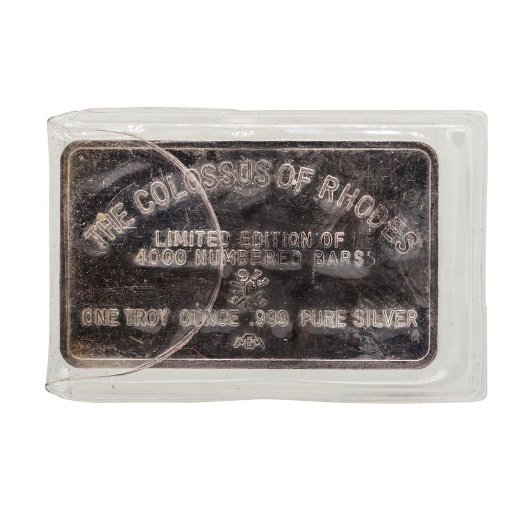 One The Colossus of Rhodes 1 oz .999 Pure Silver Art Bar.