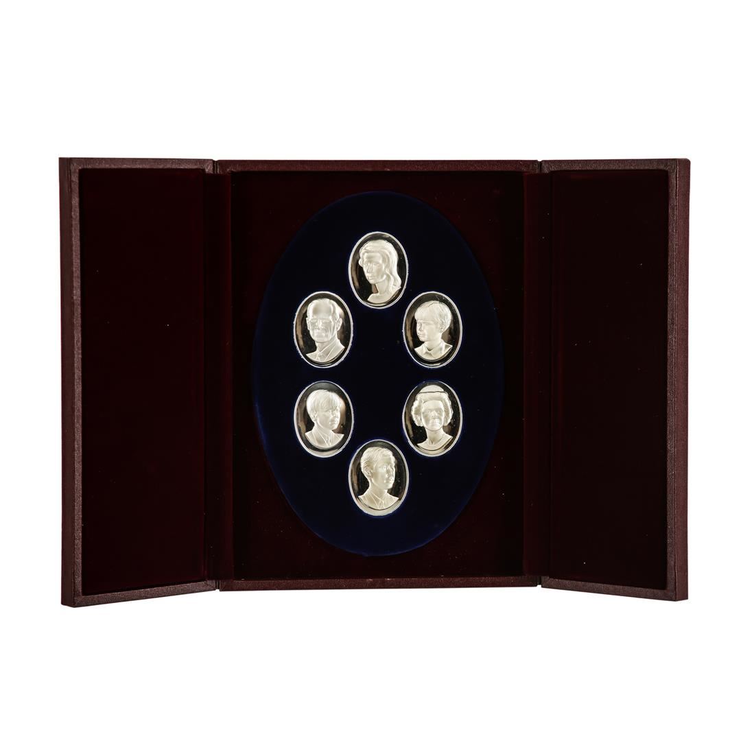 One The Royal Family (6) Sterling Silver Cameo Set. One Cameo For Each Member Of The English Royal Family As They Were In 1972. In A Beautiful, Velvet-Lined Presentation Box. This Limited Edition Of Cameos Was Struck By John Pinches (Medallists) To Coincide With The Queen'S Silver Wedding Anniversary. Featuring One Cameo Each For Her Majesty The Queen And His Royal Highness The Duke Of Edinburgh, As Well As One Each For Their Four Children: The Prince Of Wales, The Princess Anne, The Prince Andrew And The Prince Edward. Each Piece Is A Wonderful Likeness. Complete With 'An Introduction To The Royal Family' Booklet, And Contemporaneous Magazine Paperwork, Detailing The Collection And The Events Surrounding It.
