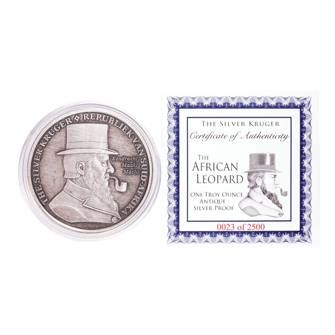 The Silver Kruger African Leopard 1 oz Antique Silver Proof Round w/COA