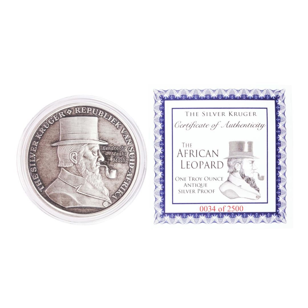 The Silver Kruger African Leopard 1 oz Antique Silver Proof Round w/COA