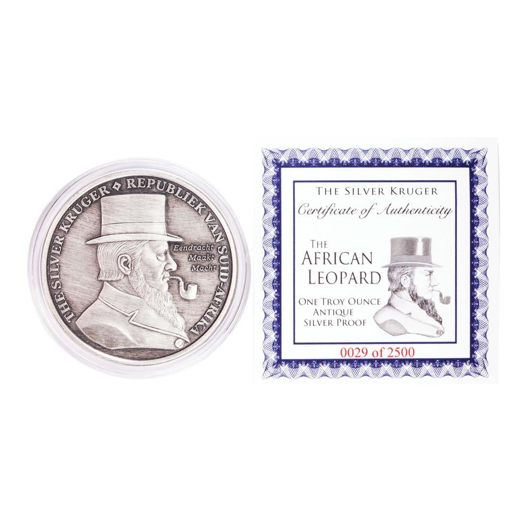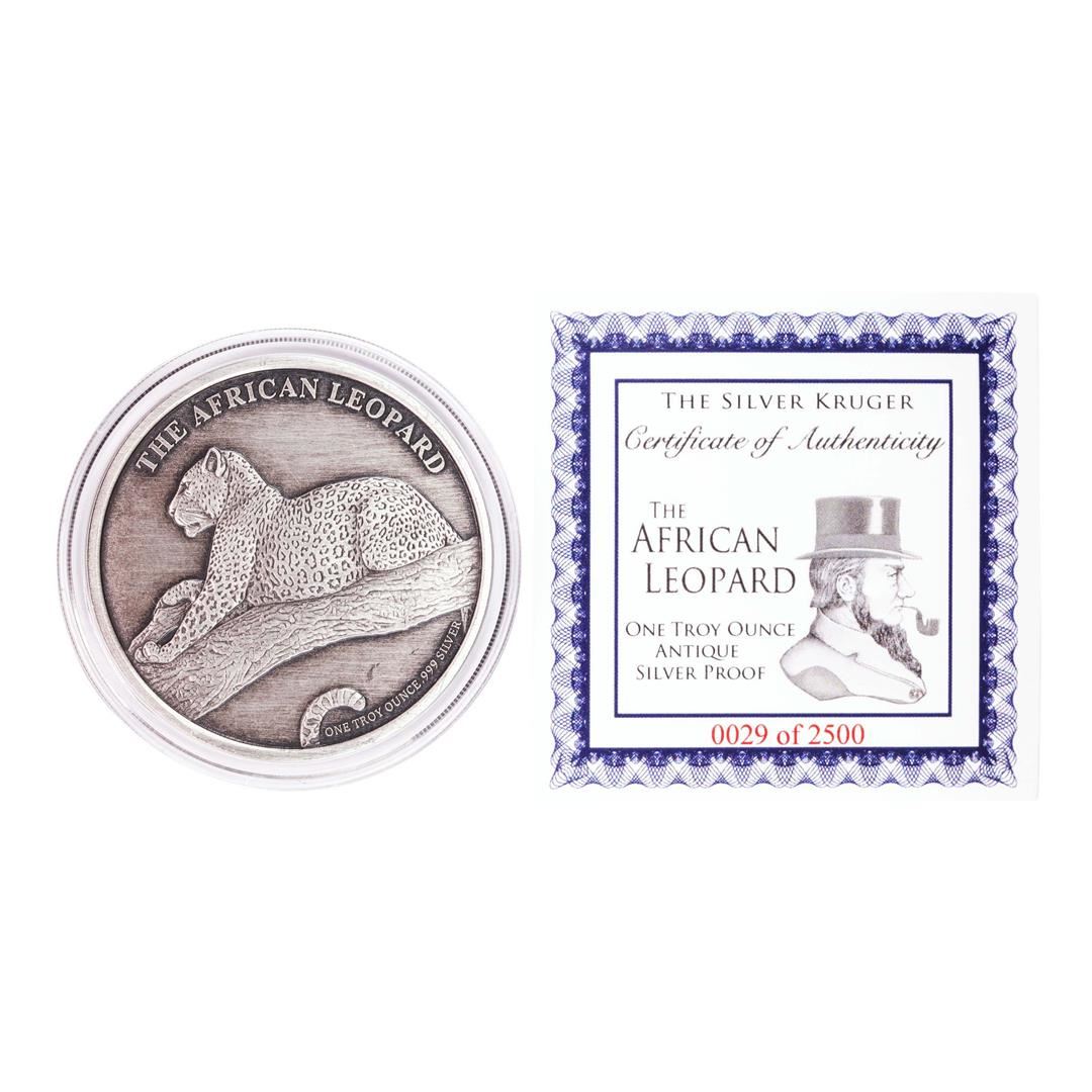 The Silver Kruger African Leopard 1 oz Antique Silver Proof Round w/COA