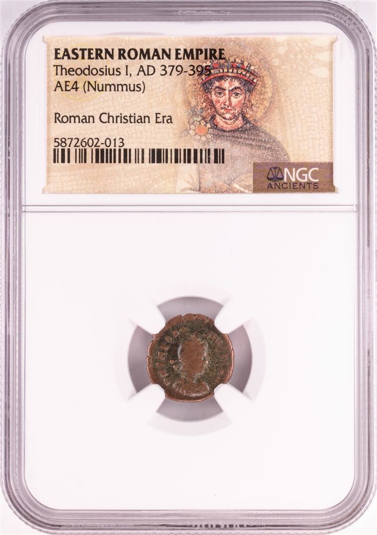 One Theodosius, AD 379-395 Nummus Ancient Eastern Roman Empire Coin NGC Certified. NGC Certified.
