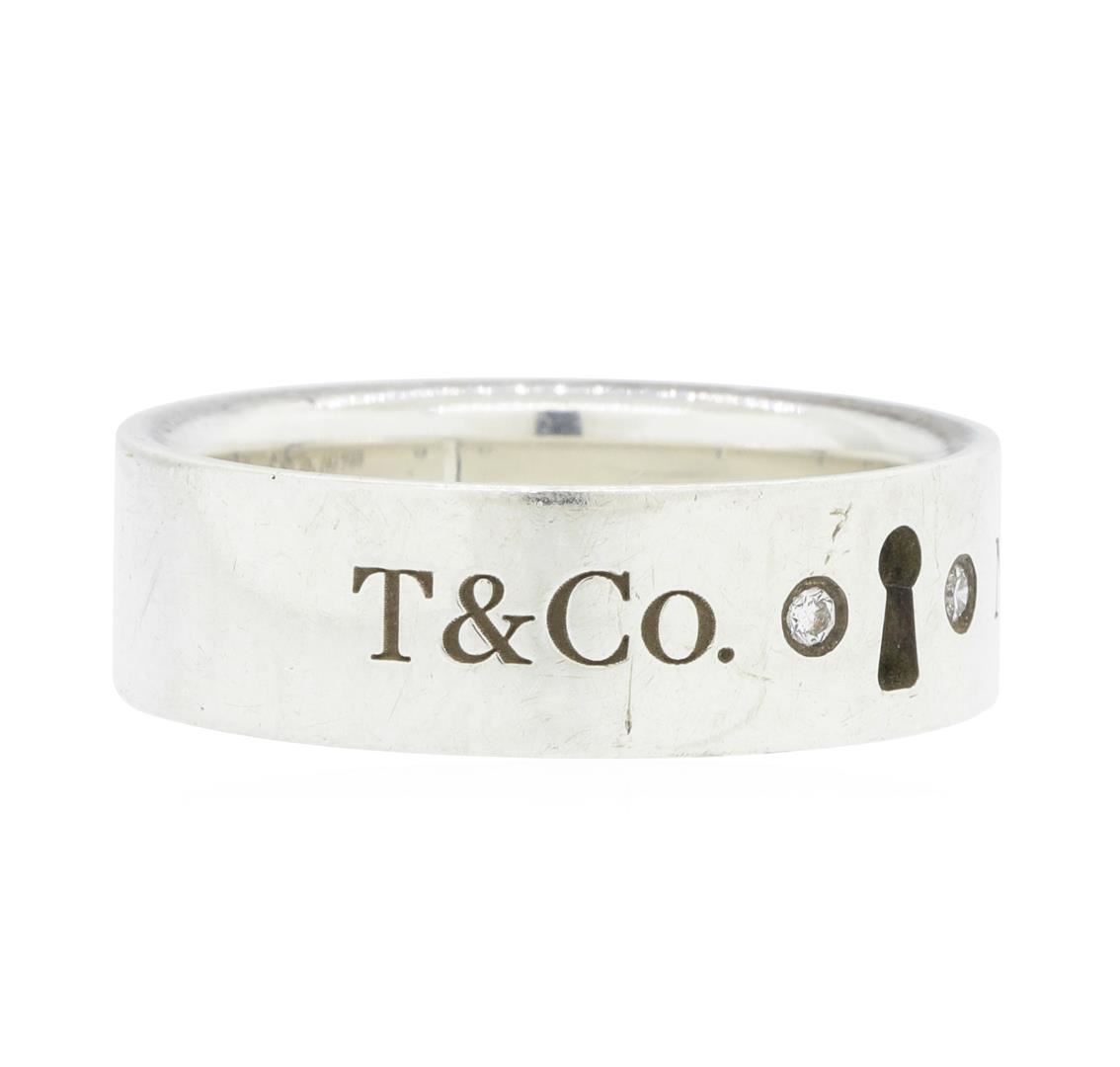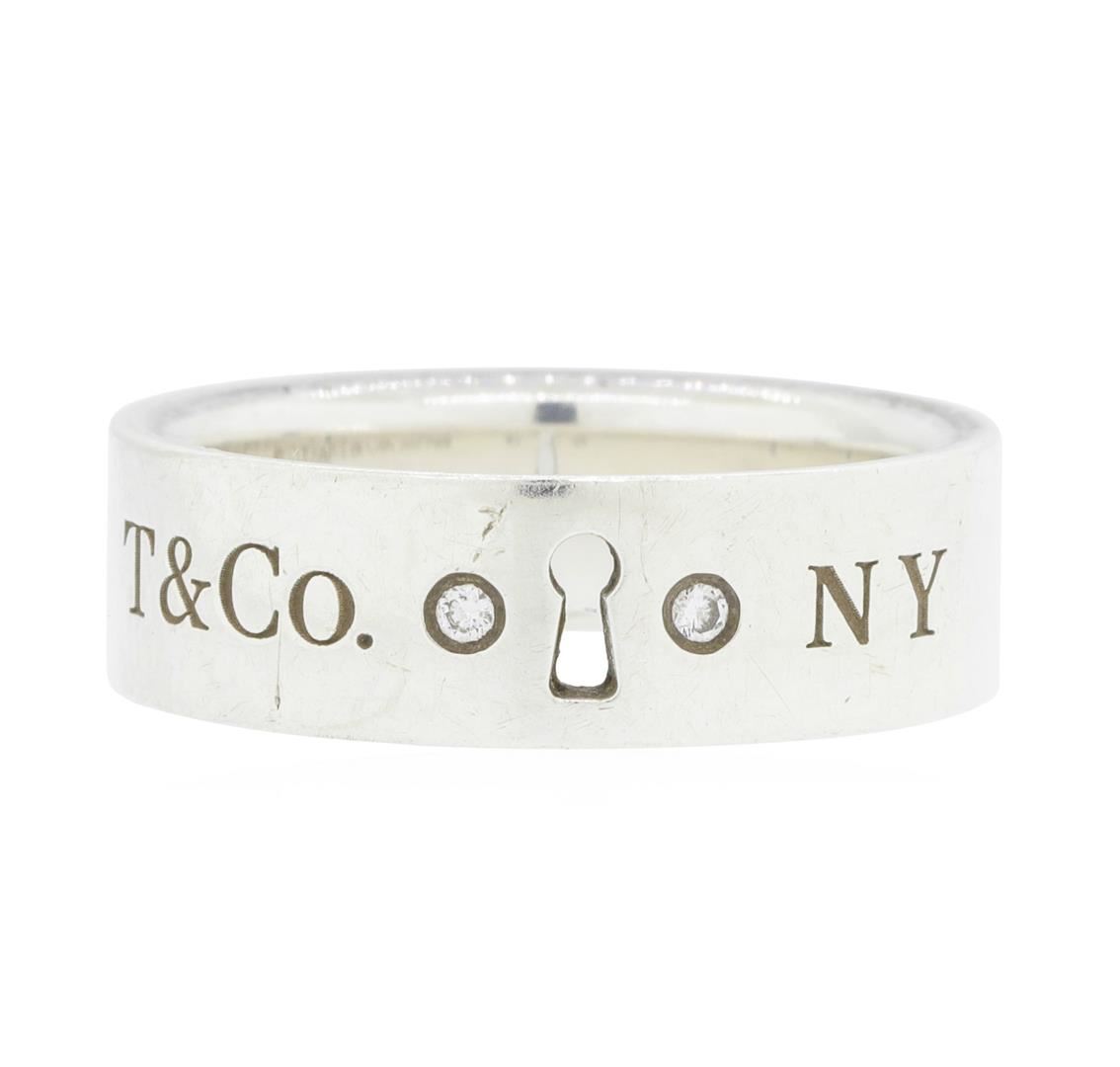 One lady's Tiffany & Company keyhole ring featuring: sterling silver weighing 5.5 grams containing two diamonds weighing 0.02ctw. The ring is a size 7.