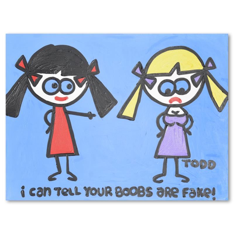 We acquired this piece as part of a larger collection. We do not approve of its inappropriate content. "Fake Boobs" is an original acrylic painting on canvas by Todd Goldman, hand signed by the artist. Includes Letter of Authenticity. Measures approx. 48" x 36" (image). Due to the way this piece was stored there may be minor wear or signs of age (such as wear on the corners) but the piece is in overall good condition.