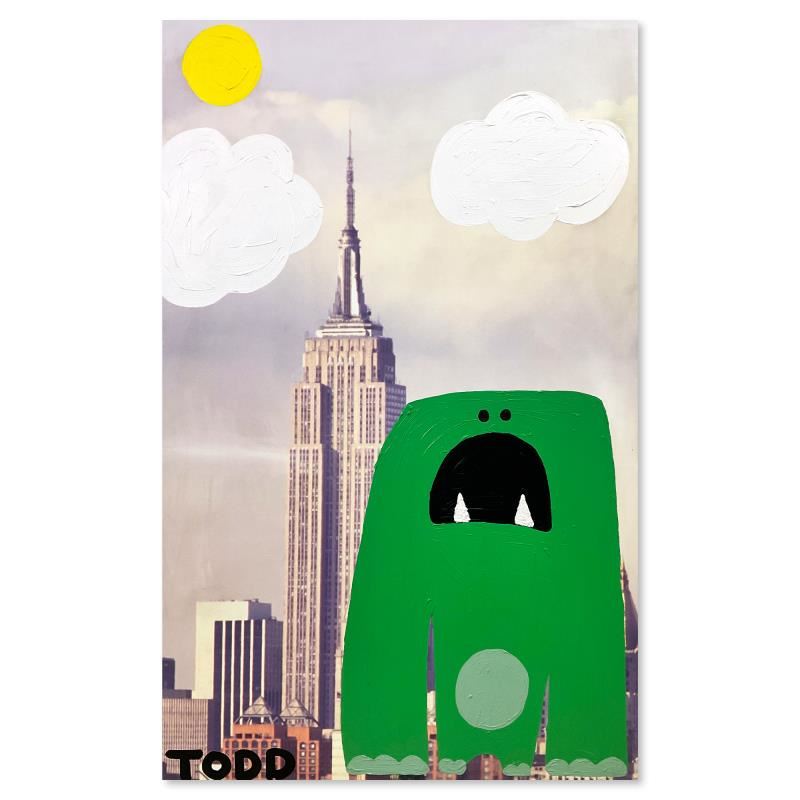 "Monsters in NY" is an original mixed media on gallery wrapped canvas by Todd Goldman, hand signed by the artist. Includes Letter of Authenticity. Measures approx. 60" x 38" (image). There is small chip in the paint on the bottom of the "D" in the signature, as well as very minor wear on the corners. Free local pickup is available on this piece.