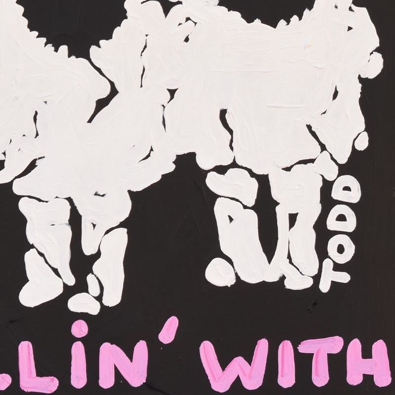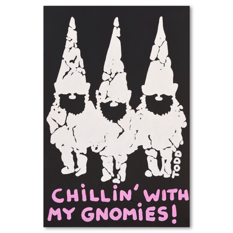 "My Gnomies" is an original acrylic painting on gallery wrapped canvas by Todd Goldman, hand signed by the artist. Includes Letter of Authenticity. Measures approx. 24" x 36" (image). Due to the way this piece was stored there may be minor wear or signs of age (such as wear on the corners) but the piece is in overall good condition.