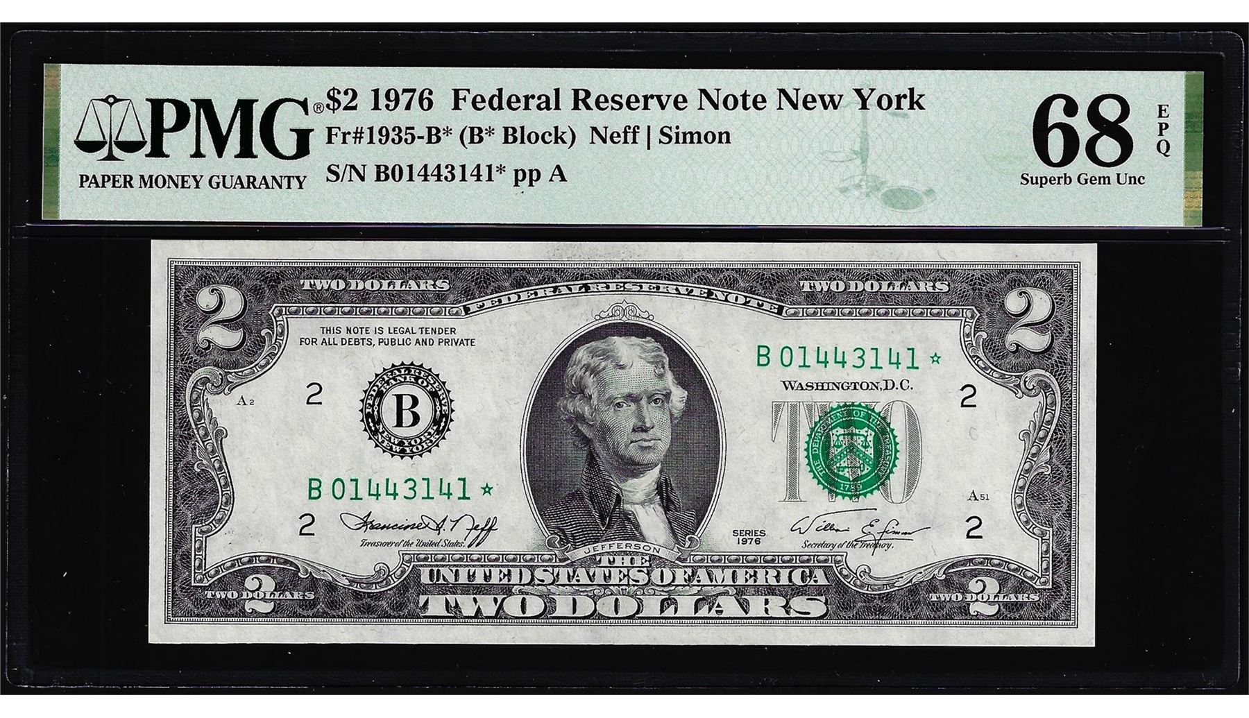 One Top Pop - 1976 $2 Federal Reserve Star Note NY Fr.1935-B* PMG Superb Gem Unc. 68EPQ. PMG Certified.