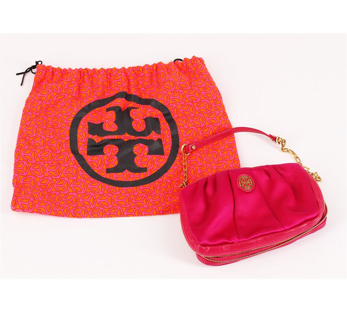 100% Authentic Tory Burch Pink Satin Mini Purse. This gorgeous fuchsia bag features golden hardware and chain wristlet strap with leather detail. The chain can be attached to either side of the bag making it a versatile wristlet clutch or mini shoulder bag. This vibrant Tory Burch bag is in great used condition with some minor signs of wear. The bottom features a leather trim and expandable design. It may look small but it will surprise you with how much it can hold. Comes with original Tory Burch drawstring dust bag.
