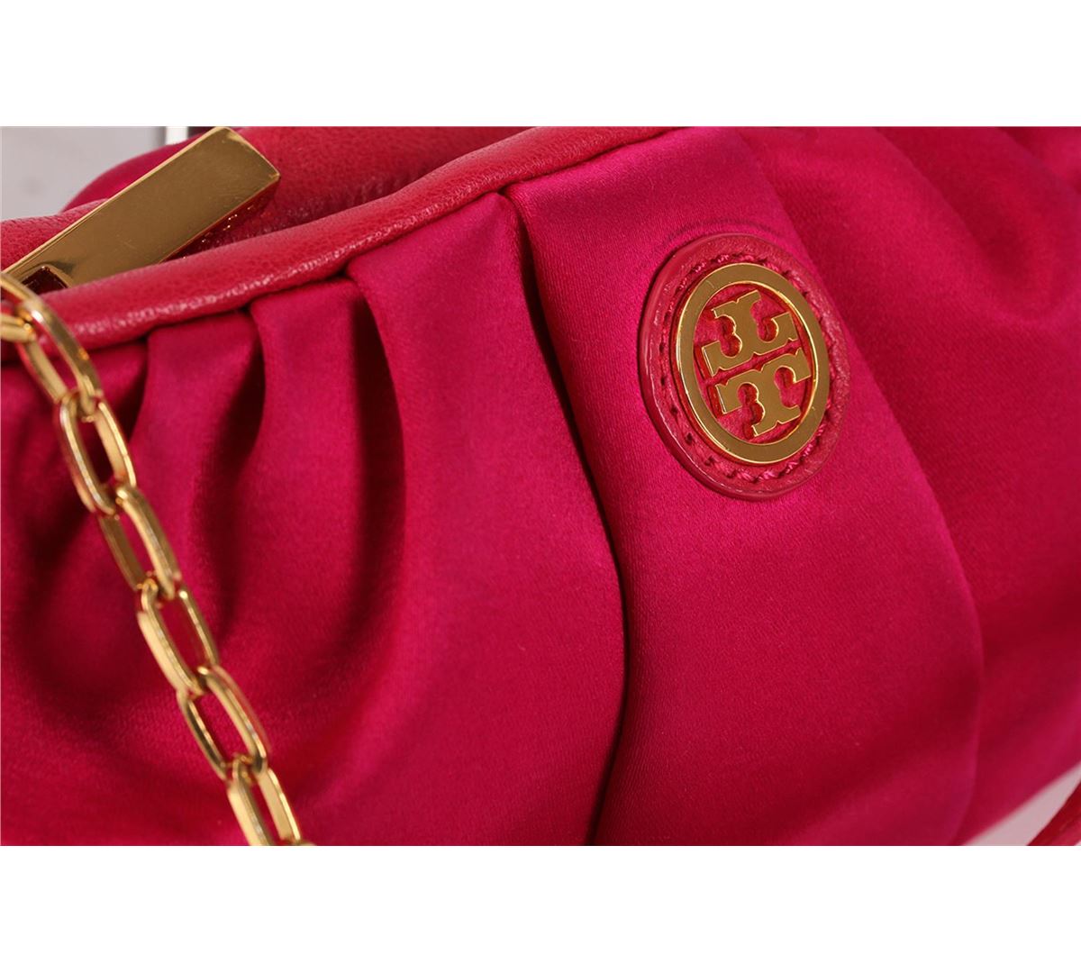 100% Authentic Tory Burch Pink Satin Mini Purse. This gorgeous fuchsia bag features golden hardware and chain wristlet strap with leather detail. The chain can be attached to either side of the bag making it a versatile wristlet clutch or mini shoulder bag. This vibrant Tory Burch bag is in great used condition with some minor signs of wear. The bottom features a leather trim and expandable design. It may look small but it will surprise you with how much it can hold. Comes with original Tory Burch drawstring dust bag.