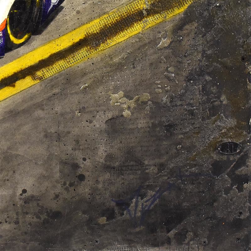 "Nascar Fed Ex" is an original mixed media acrylic painting by Trevor Mezak, hand signed by the artist. This mixed media is an acrylic painting on a concrete and metal wire surface. Includes Letter of Authenticity. Measures approx. 36" x 30" (image).