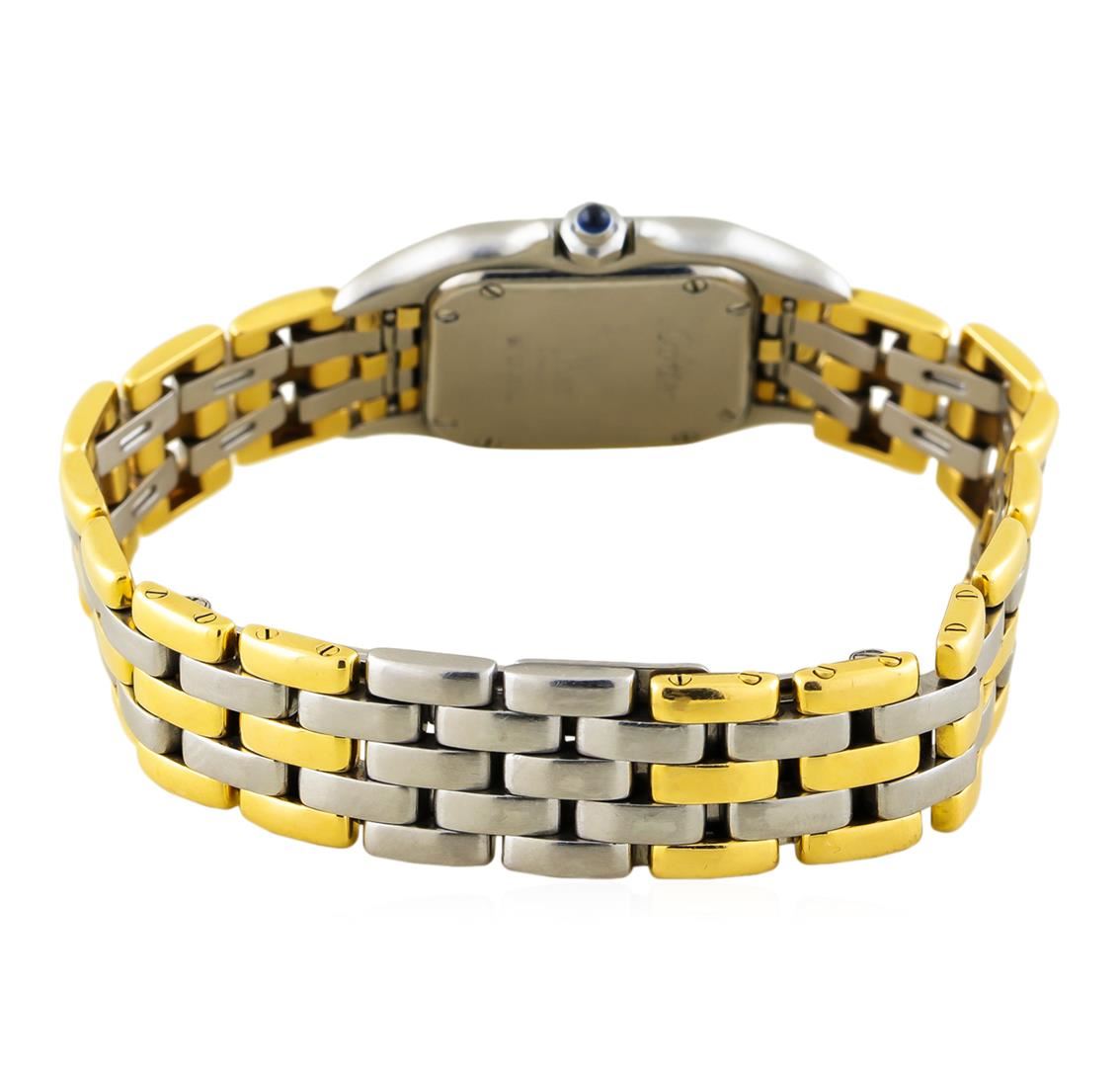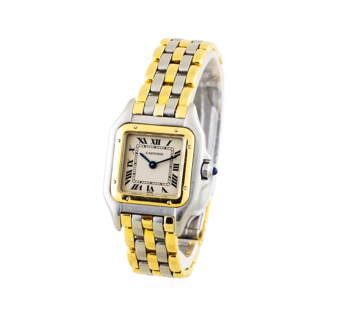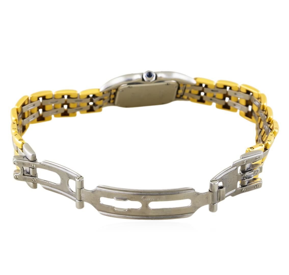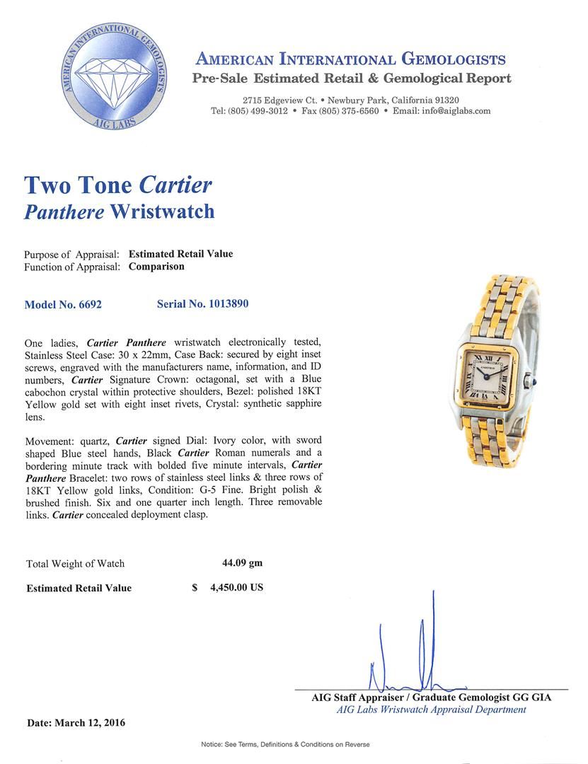 One ladies, Cartier Panthere wristwatch electronically tested, Stainless Steel Case: 30 x 22mm, Case Back: secured by eight inset screws, engraved with the manufacturers name, information, and ID numbers, Cartier Signature Crown: octagonal, set with a Blue cabochon crystal within protective shoulders, Bezel: polished 18KT Yellow gold set with eight inset rivets, Crystal: synthetic sapphire lens. Movement: quartz, Cartier signed Dial: Ivory color, with sword shaped Blue steel hands, Black Cartier Roman numerals and a bordering minute track with bolded five minute intervals, Cartier Panthere Bracelet: two rows of stainless steel links & three rows of 18KT Yellow gold links, Condition: G-5 Fine. Bright polish & brushed finish. Six and one quarter inch length. Three removable links. Cartier concealed deployment clasp. Total Weight of Watch 44.09gm. AIG Appraised at $4,450.00.