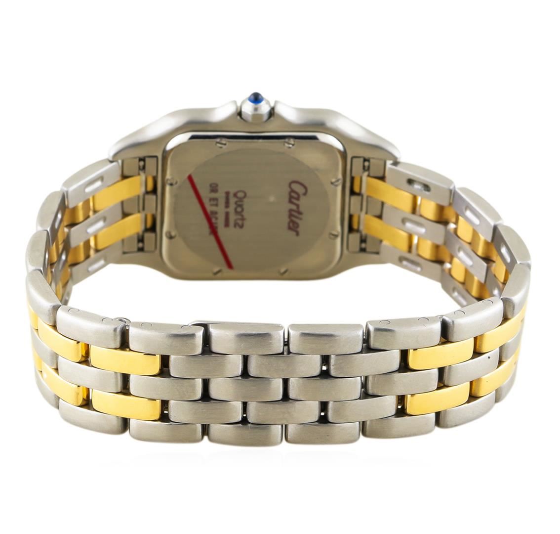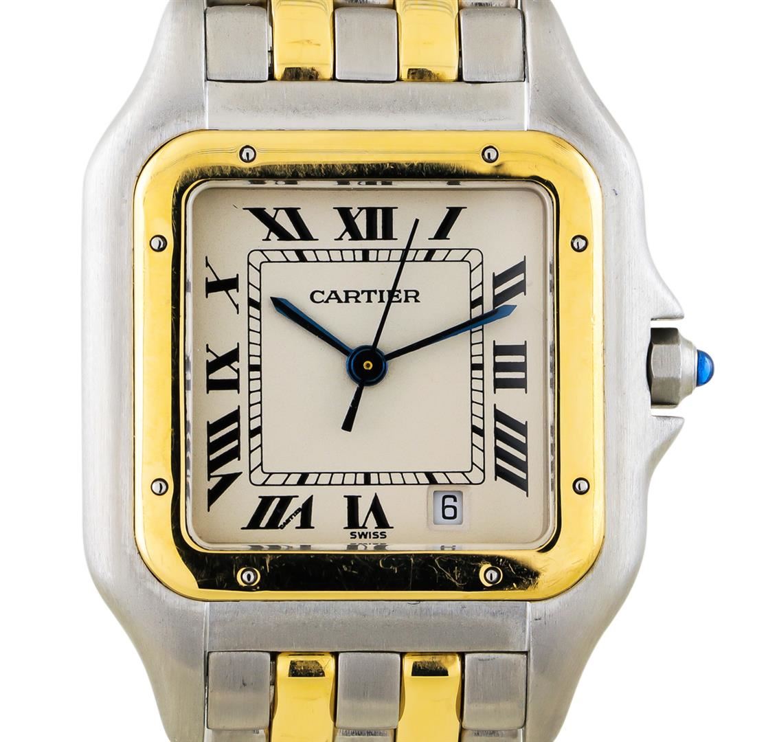 One, Cartier Panthere wristwatch electronically tested, Stainless Steel Case: 37mm x 27mm, Case Back: secured with eight set screws, engraved with the manufacturers name, information, and ID numbers, Cartier Signature Crown: octagonal, set with a blue cabochon crystal within protective shoulders, Bezel: polished yellow gold secured with eight in-set rivets, Crystal: synthetic sapphire lens. Movement: quartz, Cartier signed Dial: Ivory color, with sword shaped Blue steel hands & Black Cartier Roman numerals, Date Window: 5 o'clock position, Cartier Panthere Bracelet: three rows of stainless steel links, & two rows of 18KT yellow gold links, Condition: G-5 Fine. Bright polish & brushed finish. Six and one half inch length. Three removable links. Cartier concealed deployment clasp. Total Weight of Watch 65.68gm. AIG Appraised at $5,220.00.