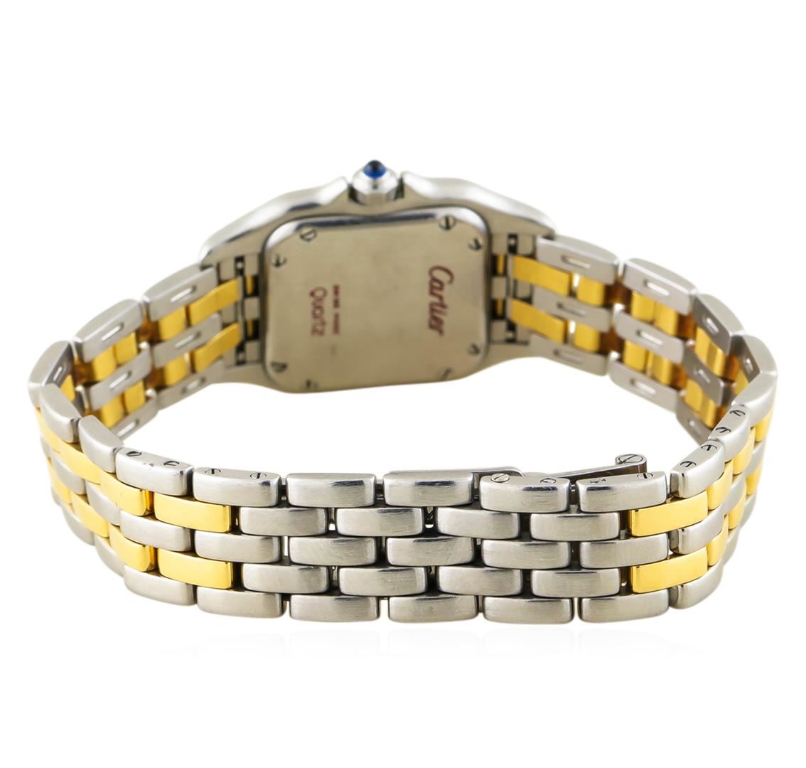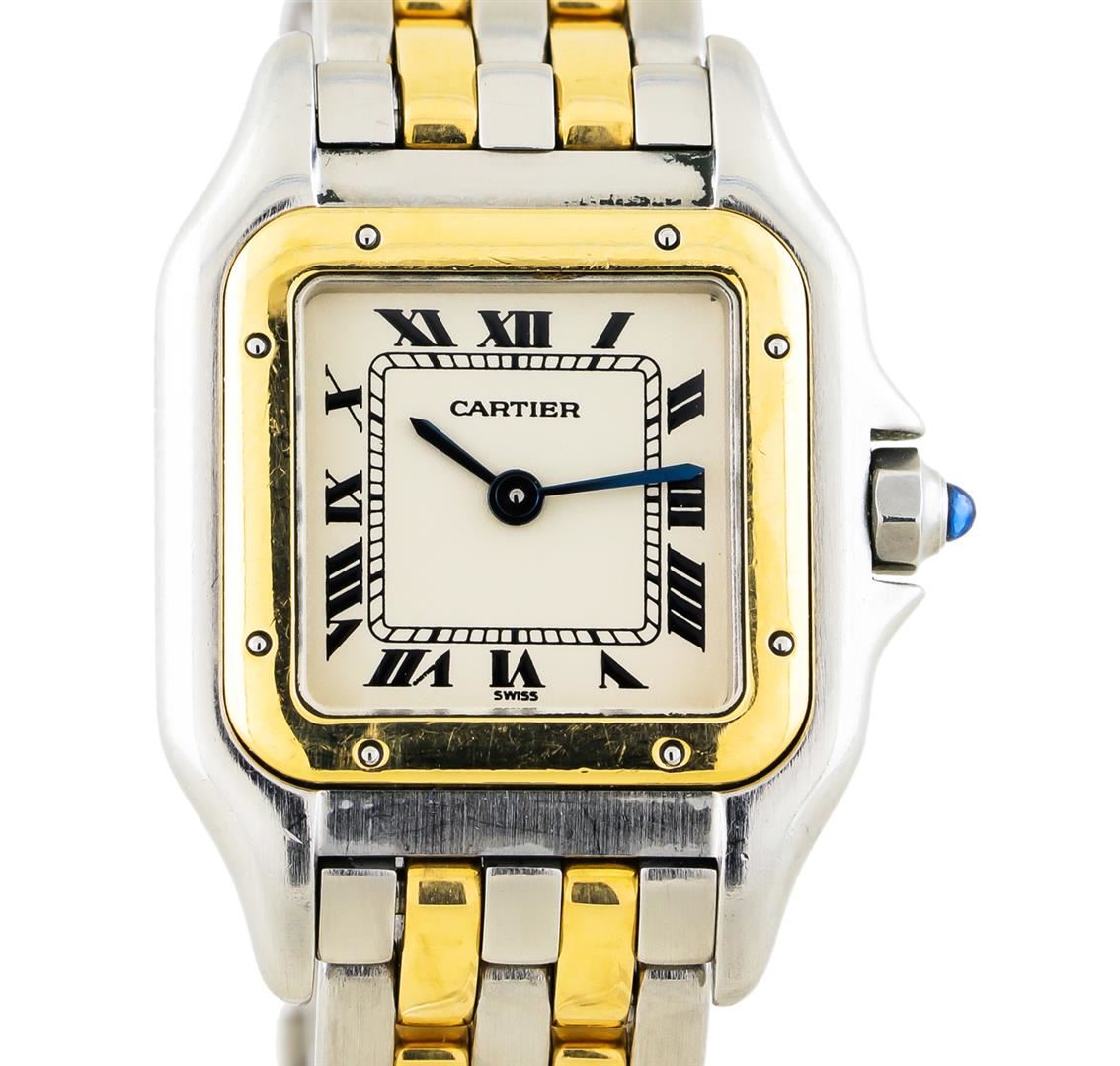 One ladies, Cartier Panthere wristwatch electronically tested, Stainless Steel Case: 30 x 22mm, Case Back: secured by eight inset screws, engraved with the manufacturers name, information, and ID numbers, Cartier Signature Crown: octagonal, set with a Blue cabochon crystal within protective shoulders, Bezel: polished 18KT Yellow gold set with eight inset rivets, Crystal: synthetic sapphire lens. Movement: quartz, Cartier signed Dial: Ivory color, with sword shaped Blue steel hands, Black Cartier Roman numerals and a bordering minute track with bolded five minute intervals, Cartier Panthere Bracelet: three rows of stainless steel links & two rows of 18KT Yellow gold links, Condition: G-5 Fine. Bright polish & brushed finish. Six and one half inch length. Four removable links. Cartier concealed deployment clasp. Total Weight of Watch 43.82gm. AIG Appraised at $4,350.00.