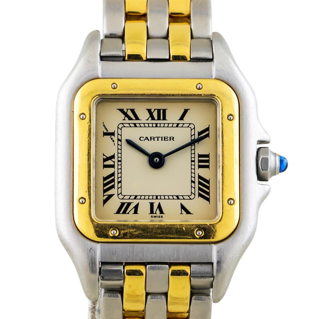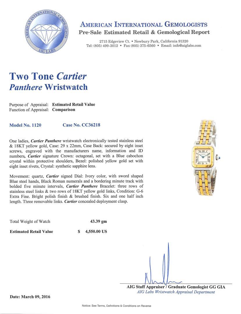 One ladies, Cartier Panthere wristwatch electronically tested stainless steel & 18KT yellow gold, Case: 29 x 22mm, Case Back: secured by eight inset screws, engraved with the manufacturers name, information and ID numbers, Cartier signature Crown: octagonal, set with a Blue cabochon crystal within protective shoulders, Bezel: polished yellow gold set with eight inset rivets, Crystal: synthetic sapphire lens. Movement: quartz, Cartier signed Dial: Ivory color, with sword shaped Blue steel hands, Black Roman numerals and a bordering minute track with bolded five minute intervals, Cartier Panthere Bracelet: three rows of stainless steel links & two rows of 18KT yellow gold links, Condition: G-6 Extra Fine. Bright polish finish & brushed finish. Six and one half inch length. Three removable links. Cartier concealed deployment clasp. Total Weight of Watch 43.39gm. AIG Appraised at $4,550.00.