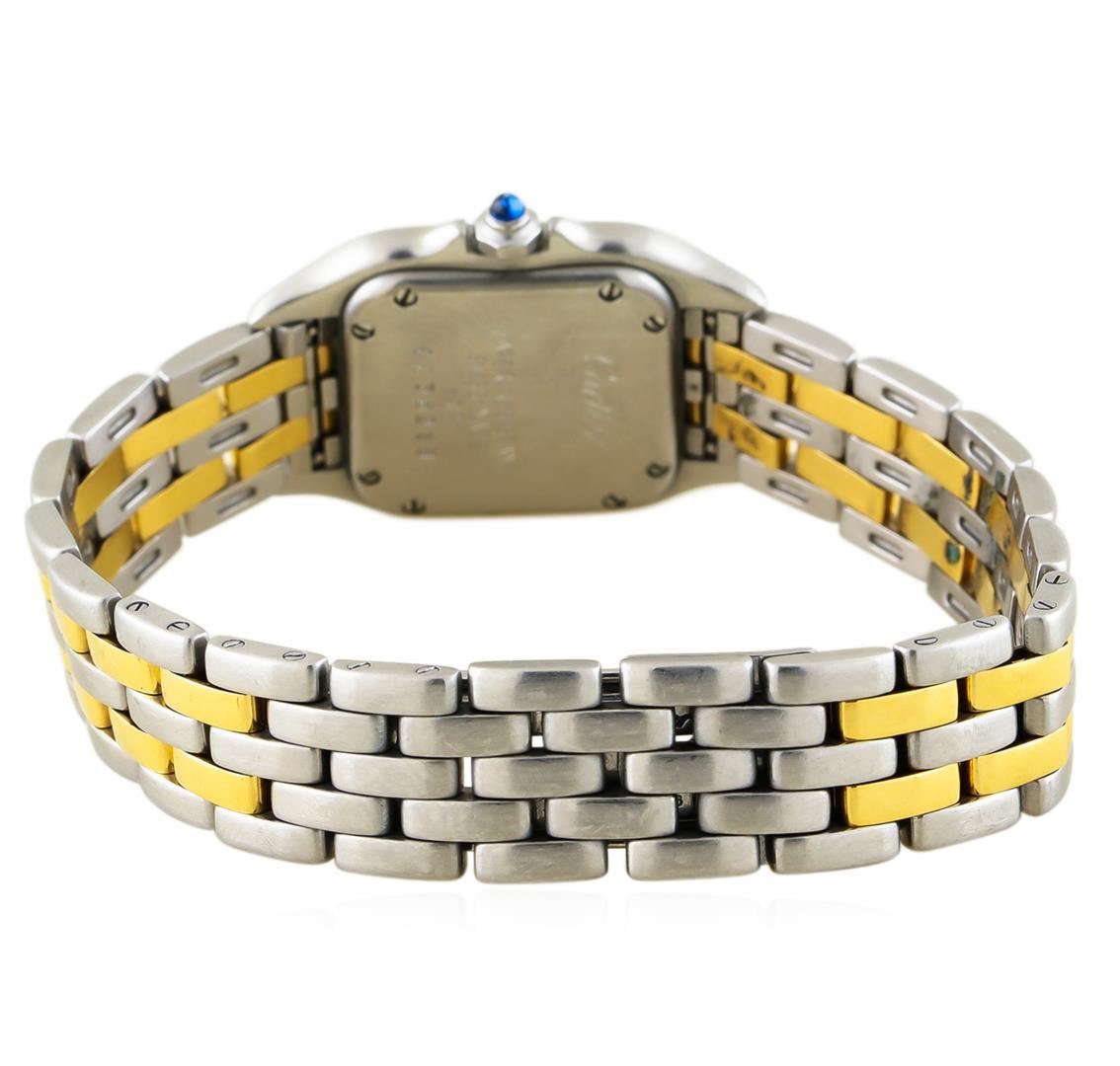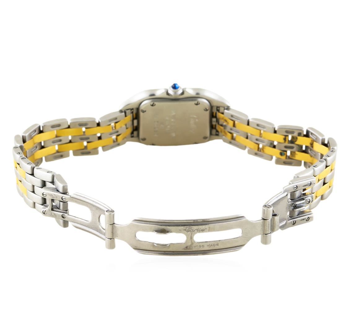One ladies, Cartier Panthere wristwatch electronically tested stainless steel & 18KT yellow gold, Case: 29 x 22mm, Case Back: secured by eight inset screws, engraved with the manufacturers name, information and ID numbers, Cartier signature Crown: octagonal, set with a Blue cabochon crystal within protective shoulders, Bezel: polished yellow gold set with eight inset rivets, Crystal: synthetic sapphire lens. Movement: quartz, Cartier signed Dial: Ivory color, with sword shaped Blue steel hands, Black Roman numerals and a bordering minute track with bolded five minute intervals, Cartier Panthere Bracelet: three rows of stainless steel links & two rows of 18KT yellow gold links, Condition: G-6 Extra Fine. Bright polish finish & brushed finish. Six and one half inch length. Three removable links. Cartier concealed deployment clasp. Total Weight of Watch 43.39gm. AIG Appraised at $4,550.00.