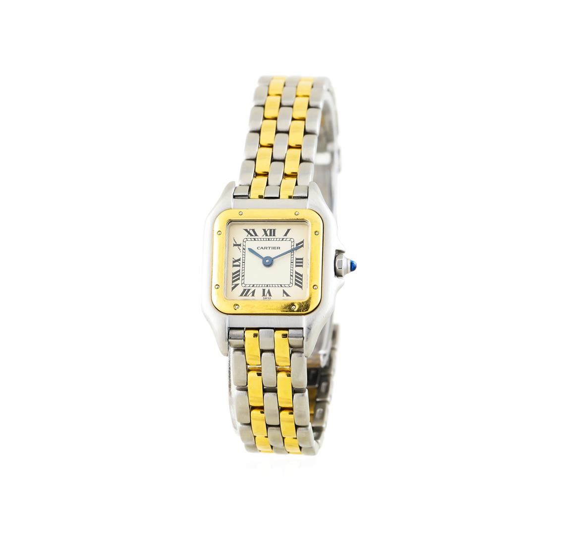 One ladies, Cartier Panthere wristwatch electronically tested stainless steel & 18KT yellow gold, Case: 29 x 22mm, Case Back: secured by eight inset screws, engraved with the manufacturers name, information and ID numbers, Cartier signature Crown: octagonal, set with a Blue cabochon crystal within protective shoulders, Bezel: polished yellow gold set with eight inset rivets, Crystal: synthetic sapphire lens. Movement: quartz, Cartier signed Dial: Ivory color, with sword shaped Blue steel hands, Black Roman numerals and a bordering minute track with bolded five minute intervals, Cartier Panthere Bracelet: three rows of stainless steel links & two rows of 18KT yellow gold links, Condition: G-6 Extra Fine. Bright polish finish & brushed finish. Six and one half inch length. Three removable links. Cartier concealed deployment clasp. Total Weight of Watch 43.39gm. AIG Appraised at $4,550.00.