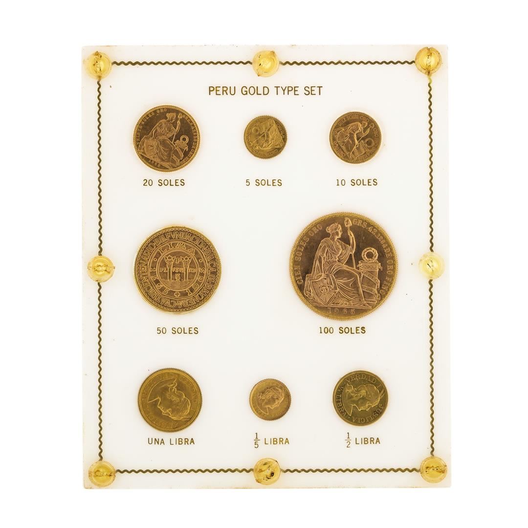 One Type Set of (8) Peru Gold Coins. (1) 20 Soles gold coin, (1) 5 Soles gold coin, (1) 10 Soles gold coin, (1) 50 Soles gold coin, (1) 100 Soles gold coin, (1) Una Libra gold coin, (1) 1/5 Libra gold coin, and (1) 1/2 Libra gold coin.