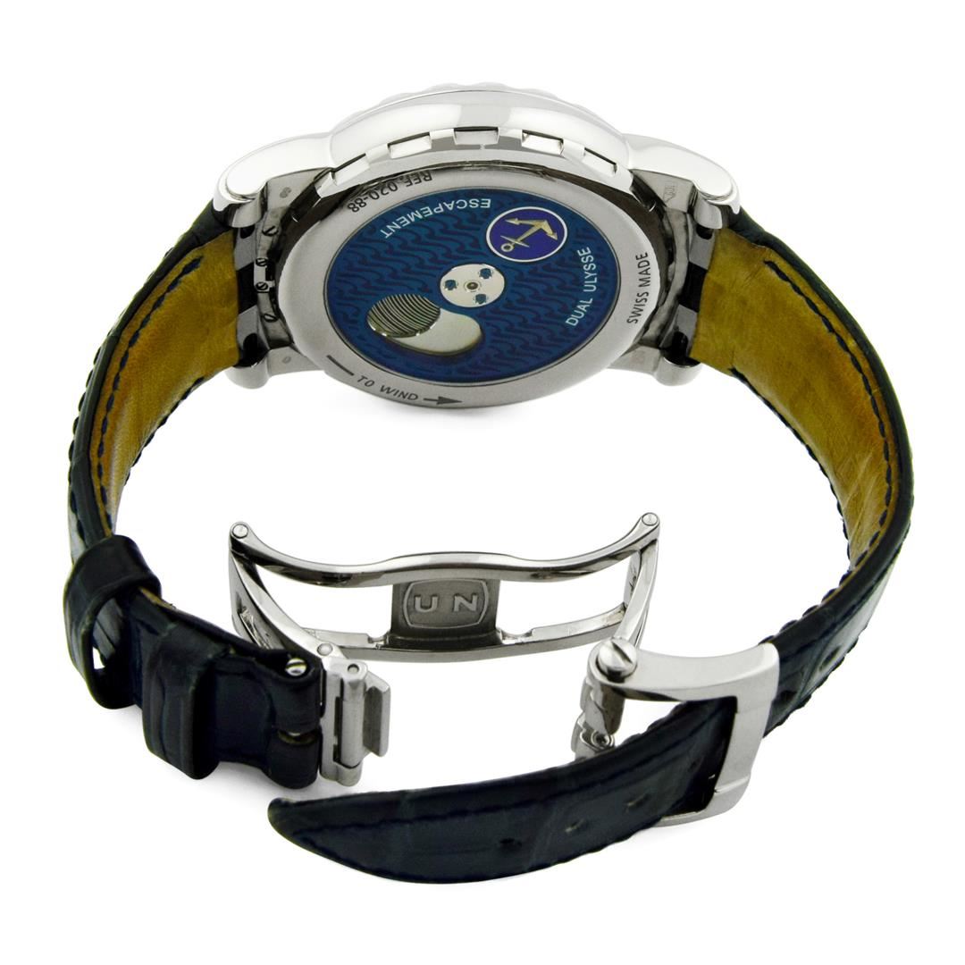Ulysse Nardin Freak Mens 44.5mm Blue Arabic Dial 18K White Gold Polished & Electronically Tested. Model: Freak020-88. Case: 18KT White Gold. Crystal: Sapphire. Bracelet: Leather Strap. Dial: Original Blue Color. Movement: Self Winding Movement. Water Resistant: Yes. Case Size: 44.5mm. Condition: Pre Owned, Scratches on Case/Bezel and Buckle, Extra Fina G-6.