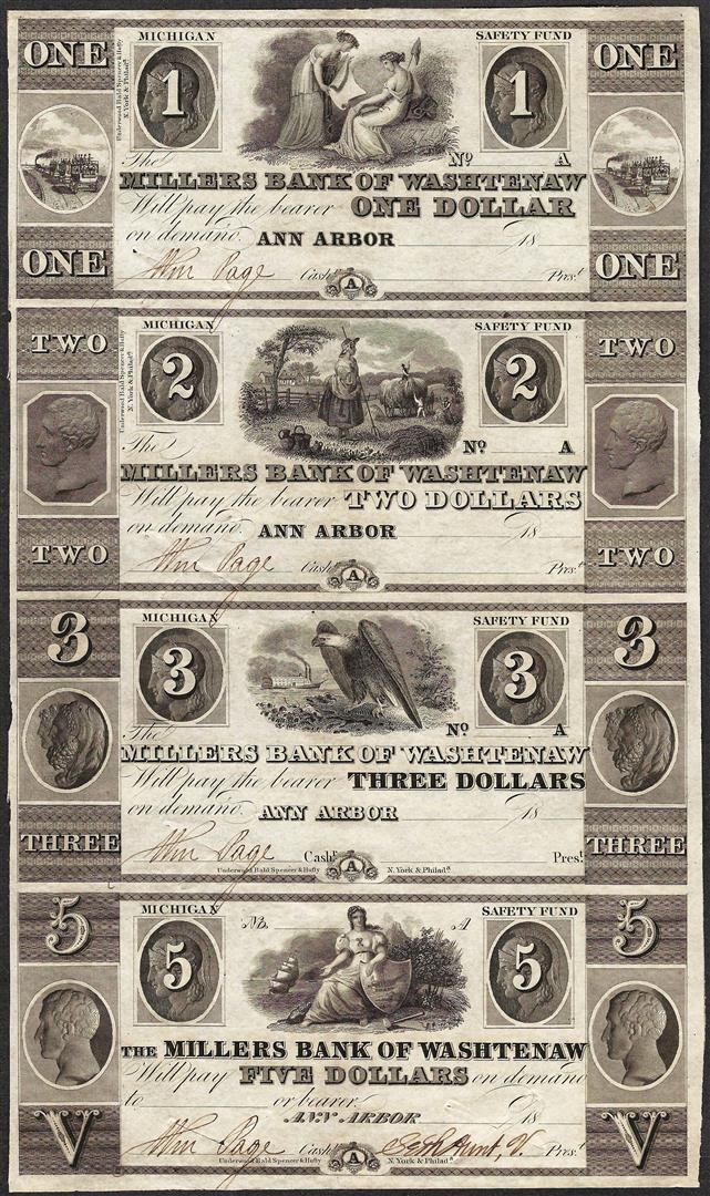 One Uncut Sheet 1800's $1/$2/$3/$5 Millers Bank of Washtenaw, MI Obsolete Bank Note.