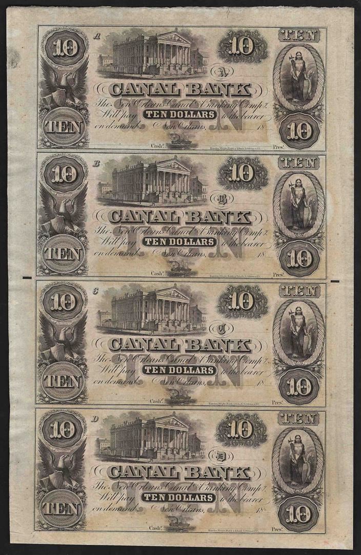 One Uncut Sheet of $10 Canal Bank New Orleans Obsolete Notes.