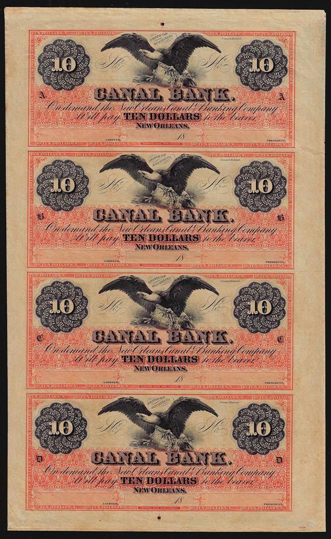 One Uncut Sheet of $10 Canal Bank New Orleans Obsolete Notes.
