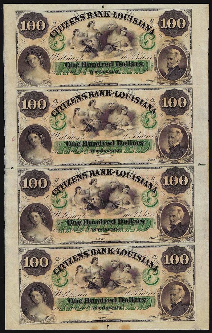 One Uncut Sheet of $100 Citizens Bank of Louisiana Obsolete Notes.