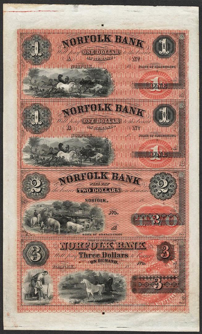 One Uncut Sheet of 1800's $1/$1/$2/$3 Norfolk Bank, CT Obsolete Notes.