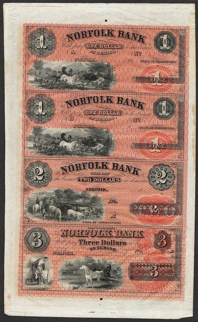 One Uncut Sheet of 1800's $1/$1/$2/$3 Norfolk Bank, CT Obsolete Notes.