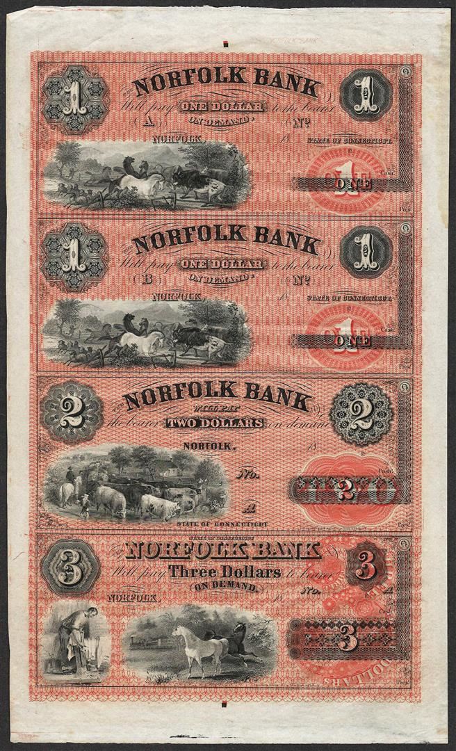 One Uncut Sheet of 1800's $1/$1/$2/$3 Norfolk Bank, CT Obsolete Notes.