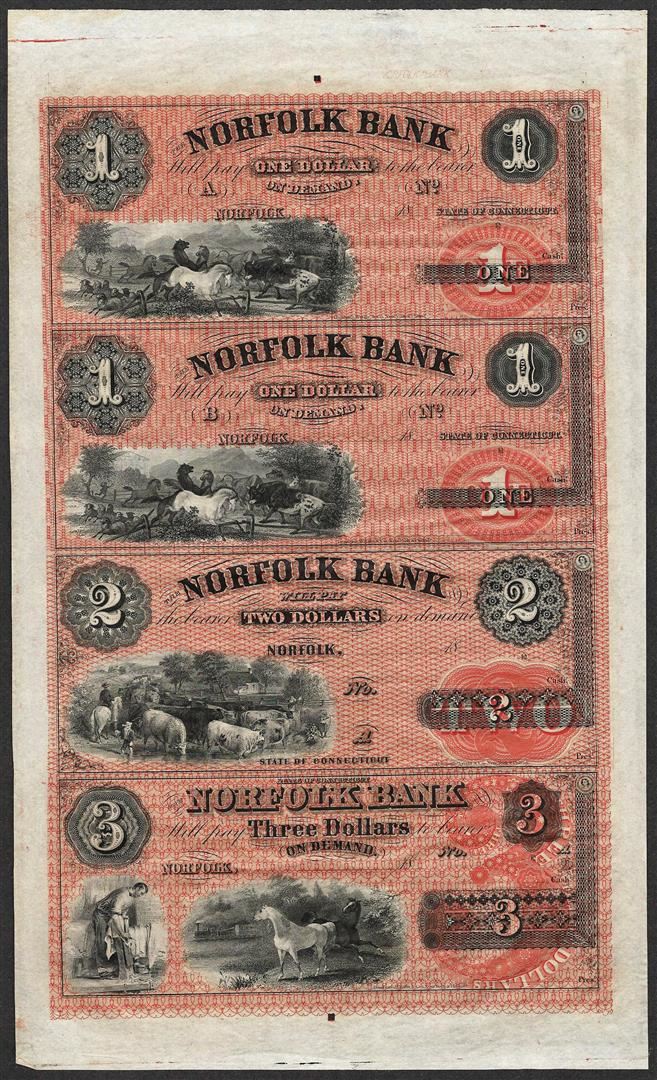 One Uncut Sheet of 1800's $1/$1/$2/$3 Norfolk Bank, CT Obsolete Notes.