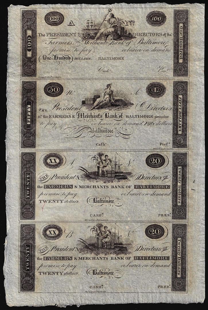 One Uncut Sheet of 1800's $20/20/50/100 Farmer's & Merchants Bank Baltimore Obsolete Notes.