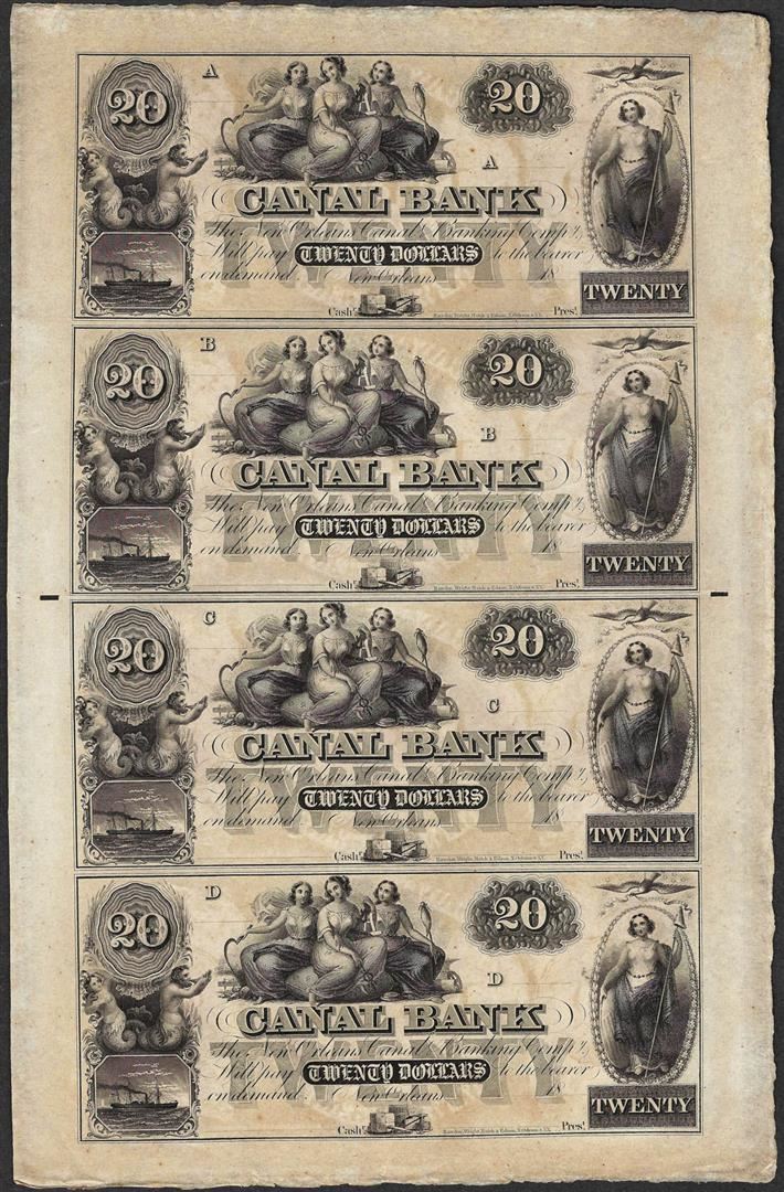 One Uncut Sheet of 1800's $20 Canal Bank Obsolete Notes.