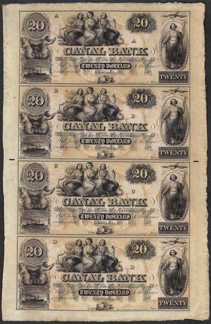 One Uncut Sheet of 1800's $20 Canal Bank Obsolete Notes.