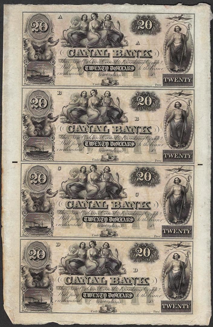 One Uncut Sheet of 1800's $20 Canal Bank Obsolete Notes.