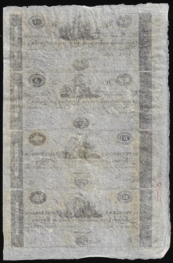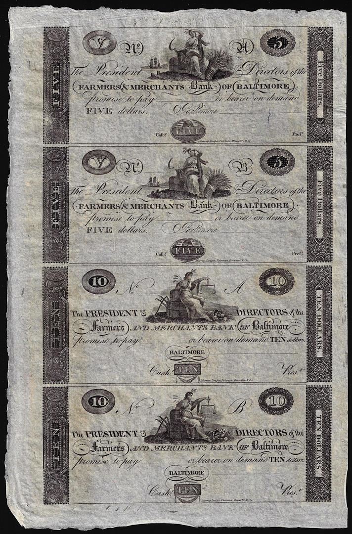 One Uncut Sheet of 1800's $5/5/10/10 Farmer's & Merchants Bank of Baltimore Obsolete Notes.