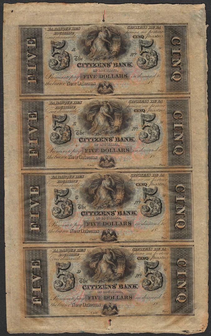 One Uncut Sheet of 1800's $5 Citizens Bank of Louisiana Obsolete Notes.