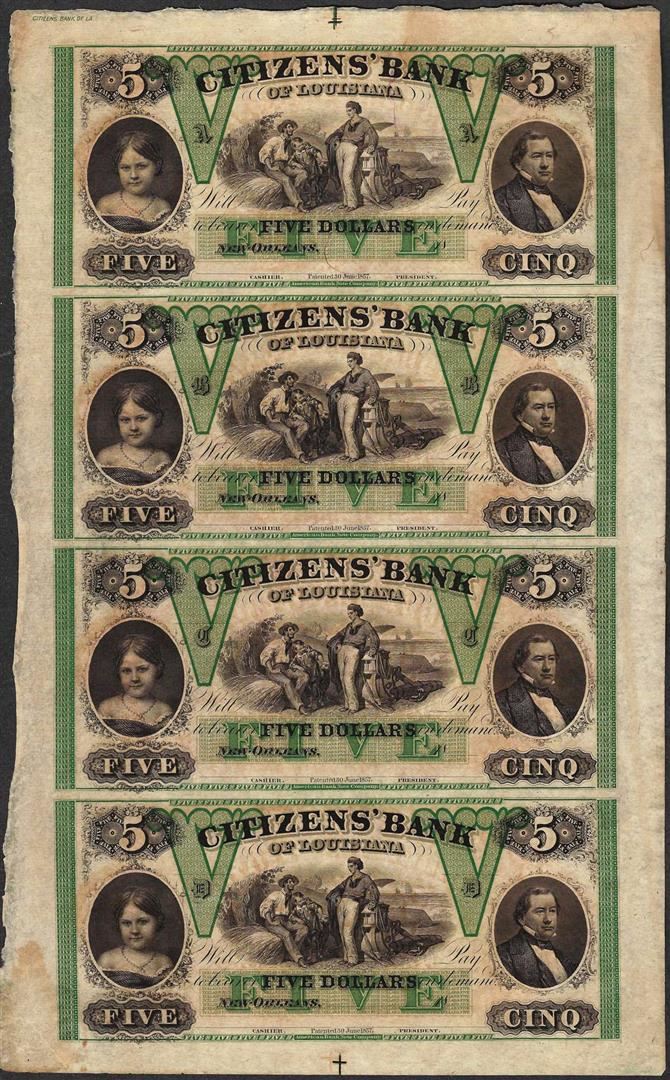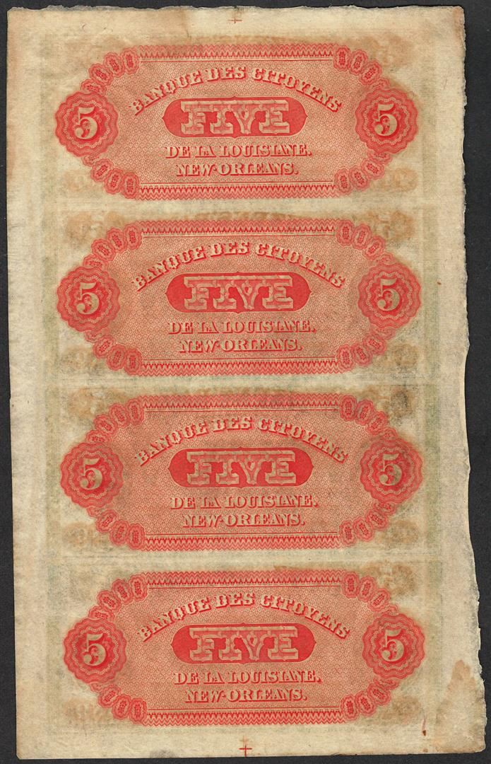 Uncut Sheet of 1800's $5 Citizens Bank of Louisiana Obsolete Notes