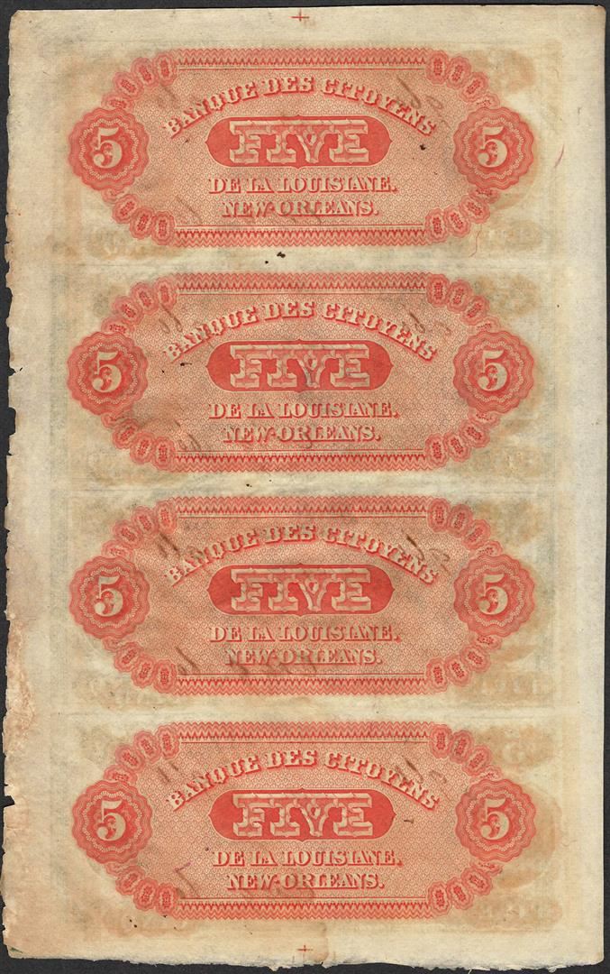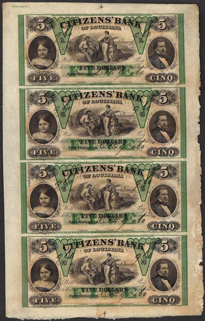 Uncut Sheet of 1800's $5 Citizens Bank of Louisiana Obsolete Notes