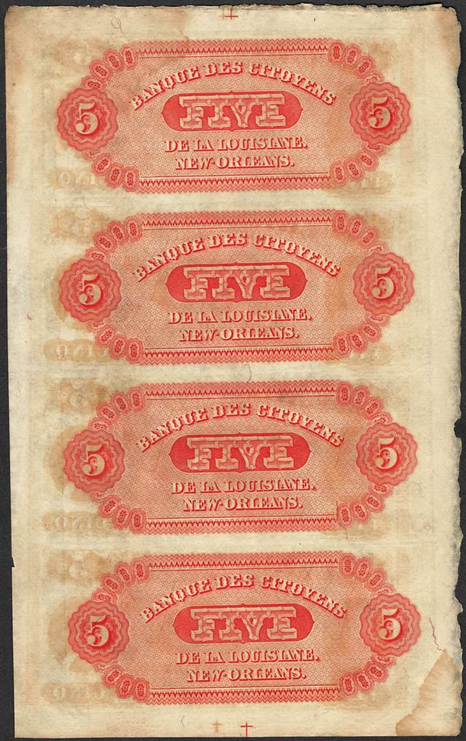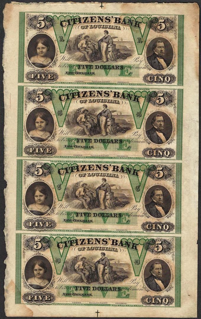 Uncut Sheet of 1800's $5 Citizens Bank of Louisiana Obsolete Notes